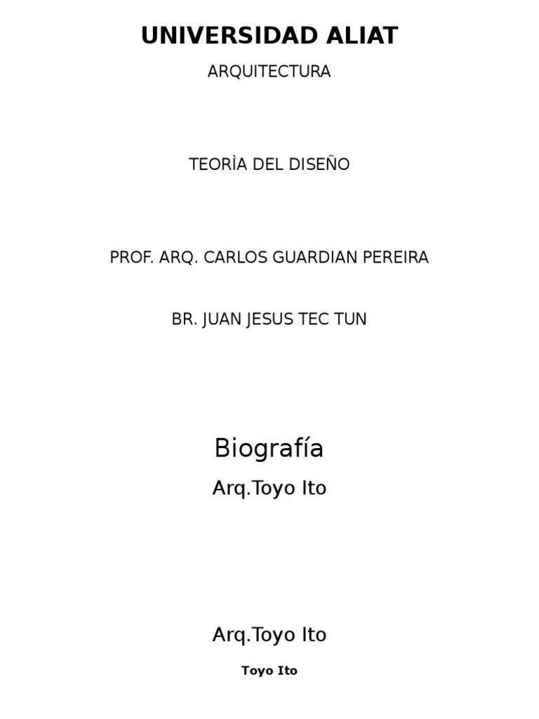 Cursó sus estudios de arquitectura en la universidad de tokio, donde se graduó en 1965... De padres japoneses fue a japón con su madre y sus hermanas en 1943, su padre regresó allí unos años más tarde. Es considerado por muchos críticos como uno de los más influyentes e innovadores … Su los diseños de su obra arquitectónica reflejan un aire de optimismo,. Su estilo venia marcado por la transparencia y por un carácter frágil y efímero. Tras estudiar en la universidad nacional de tokio, abre en 1971 su propio estudio bajo el nombre de urbot en esa misma ciudad.en 1979, el estudio pasa a denominarse toyo ito y asociados y, a partir de entonces, comienza un período de expansión internacional. La biografía de toyo ito nos acerca a un reconocido arquitecto japonés, cuyos diseños arquitectónicos excepcionales mantienen edificaciones atemporales, proponiendo nuevos caminos en diversos proyectos, pero además buscando ampliar las posibilidades de la propia arquitectura. Es considerado por muchos críticos como uno de los más influyentes e innovadores …