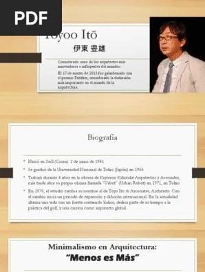 Se le considera como un destacado exponente de la arquitectura moderna que trabaja con la noción contemporánea de crear ciudades simuladas. Toyo ito (tokyo, 1941) arquitecto japonés. El arquitecto japonés toyo ito es conocido por crear una arquitectura de tipo conceptual. Se le considera como un destacado exponente de la arquitectura moderna que trabaja con la noción contemporánea de crear ciudades simuladas. Su estilo venia marcado por la transparencia y por un carácter frágil y efímero. Toyo ito (seúl, 1941) es uno de los arquitectos más innovadores e influyentes del panorama actual. 13.01.2018 · biografia de toyo ito. In 1943 sie kehrte nach japan zurück, zusammen mit seinem vater und zwei schwestern, und in 1953 es war der tod seines vaters, als toyo ito war 12 jahre alt.